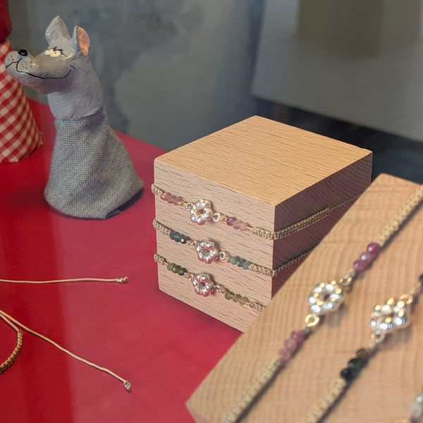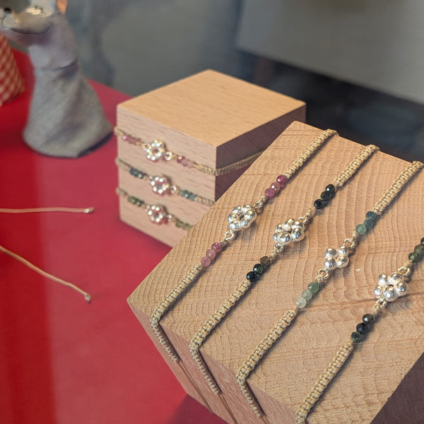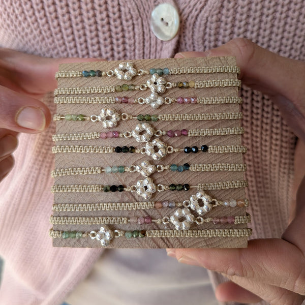 Aquest any cada braçalet de Sant Jordi és únic, fets a mà un a un de plata i turmalines naturals, tots de colors diferents.
